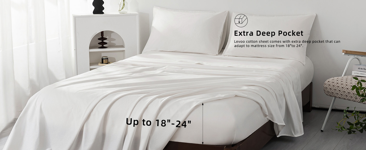 EXTRA DEEP POCKET: The queen sheet set deep pocket fits 18"-24" extra-deep mattress. Levoo sheet solves the problem of extra high and thick mattress without suitable sheets. This Egyptian Cotton fitted sheet queen is designed with a reinford, stretchable elastic band all the way around the edge, so it won’t ride up or move around.