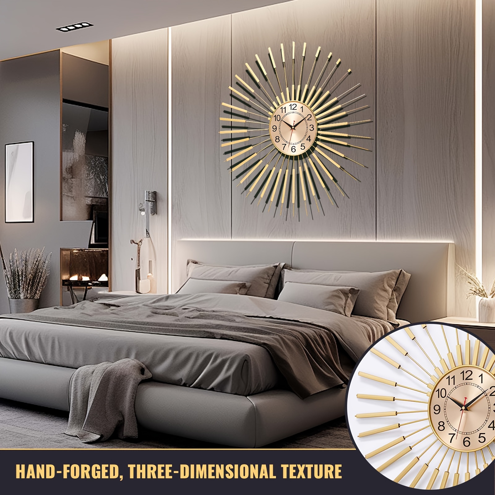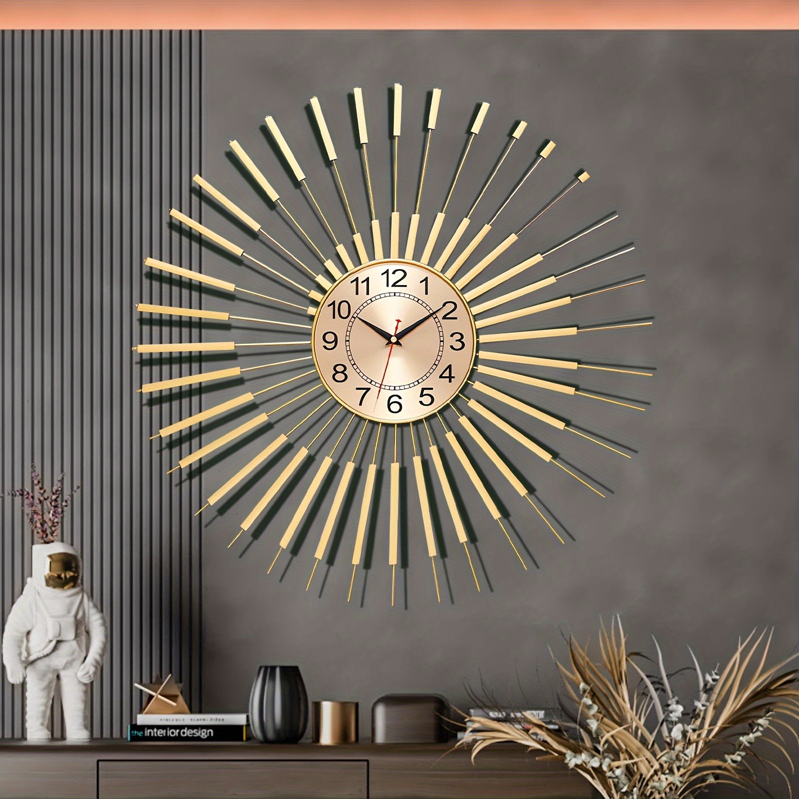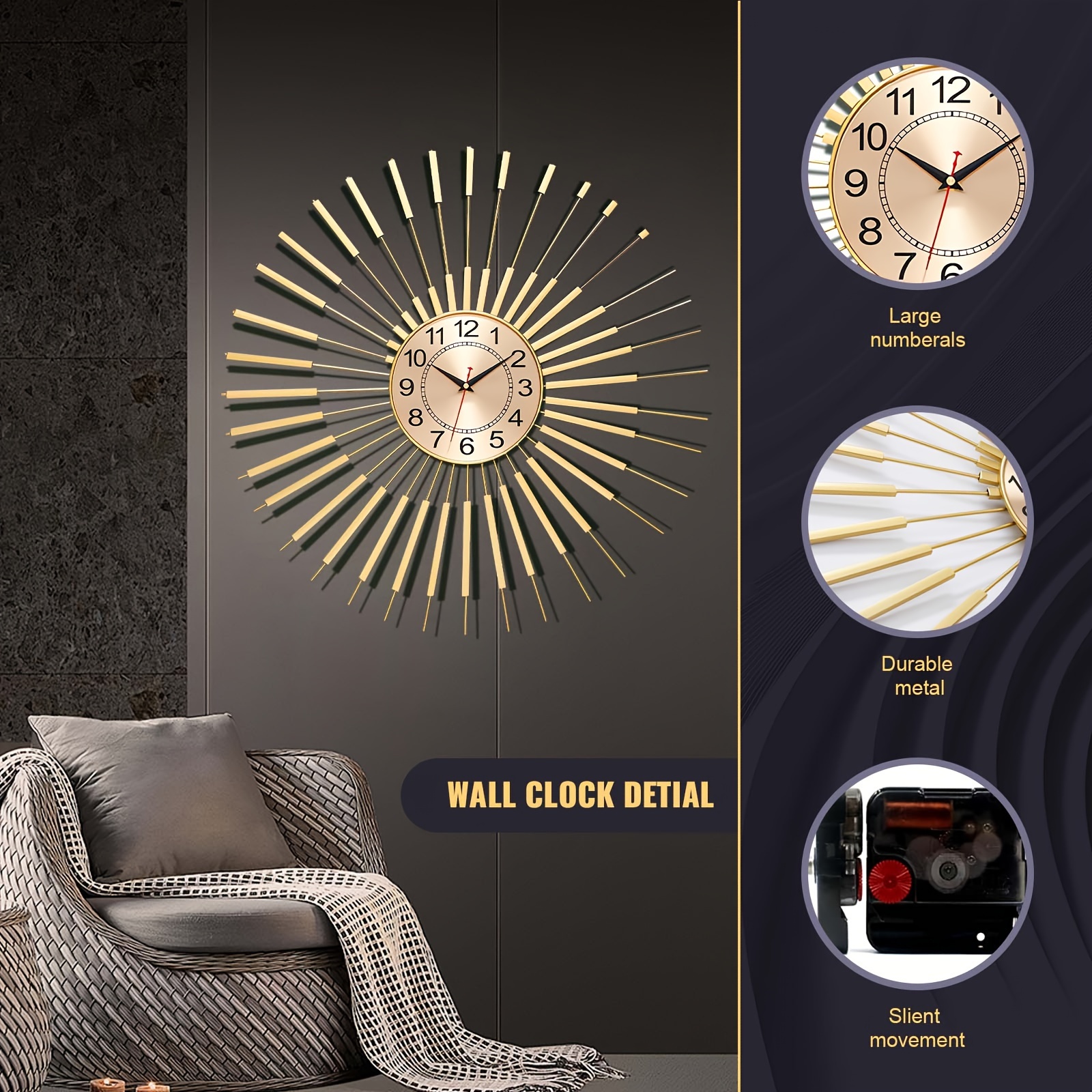 24 Inch Large Starburst Decorative Wall Clock for Living Room Non-Ticking Golden Big Modern Metal Round Wall Clocks for Kitchen, Dining Room, Office, Kitchen Clock, Contemporary Clock, Stylish Timepiece, Silent Movement, Sile