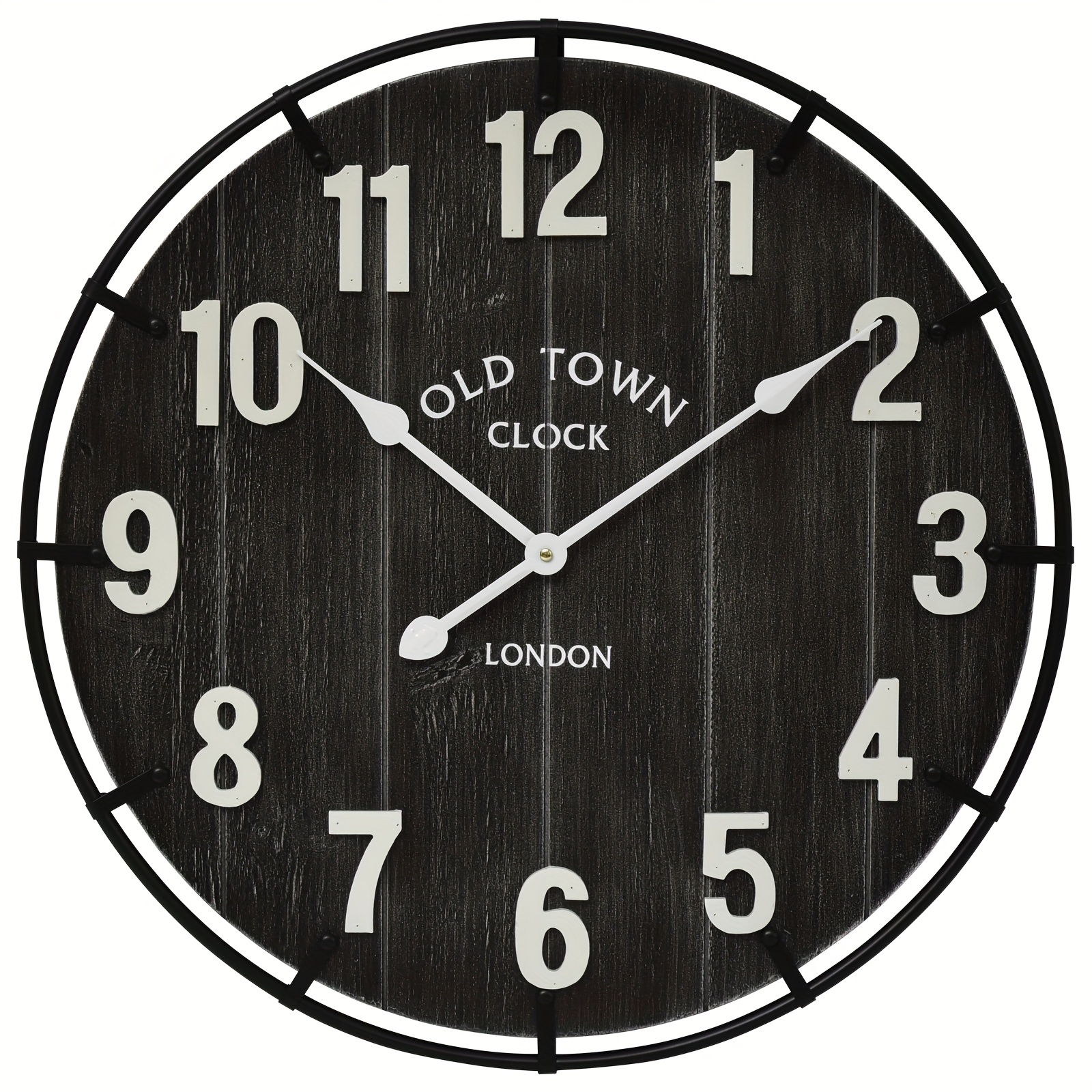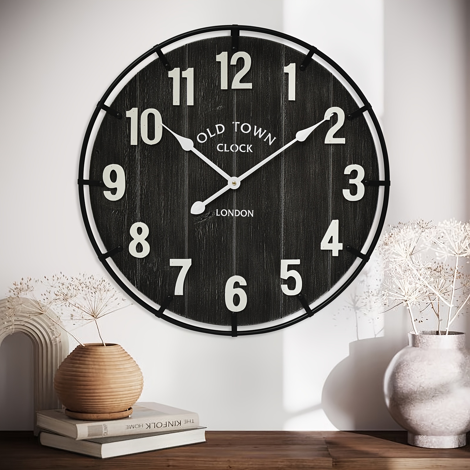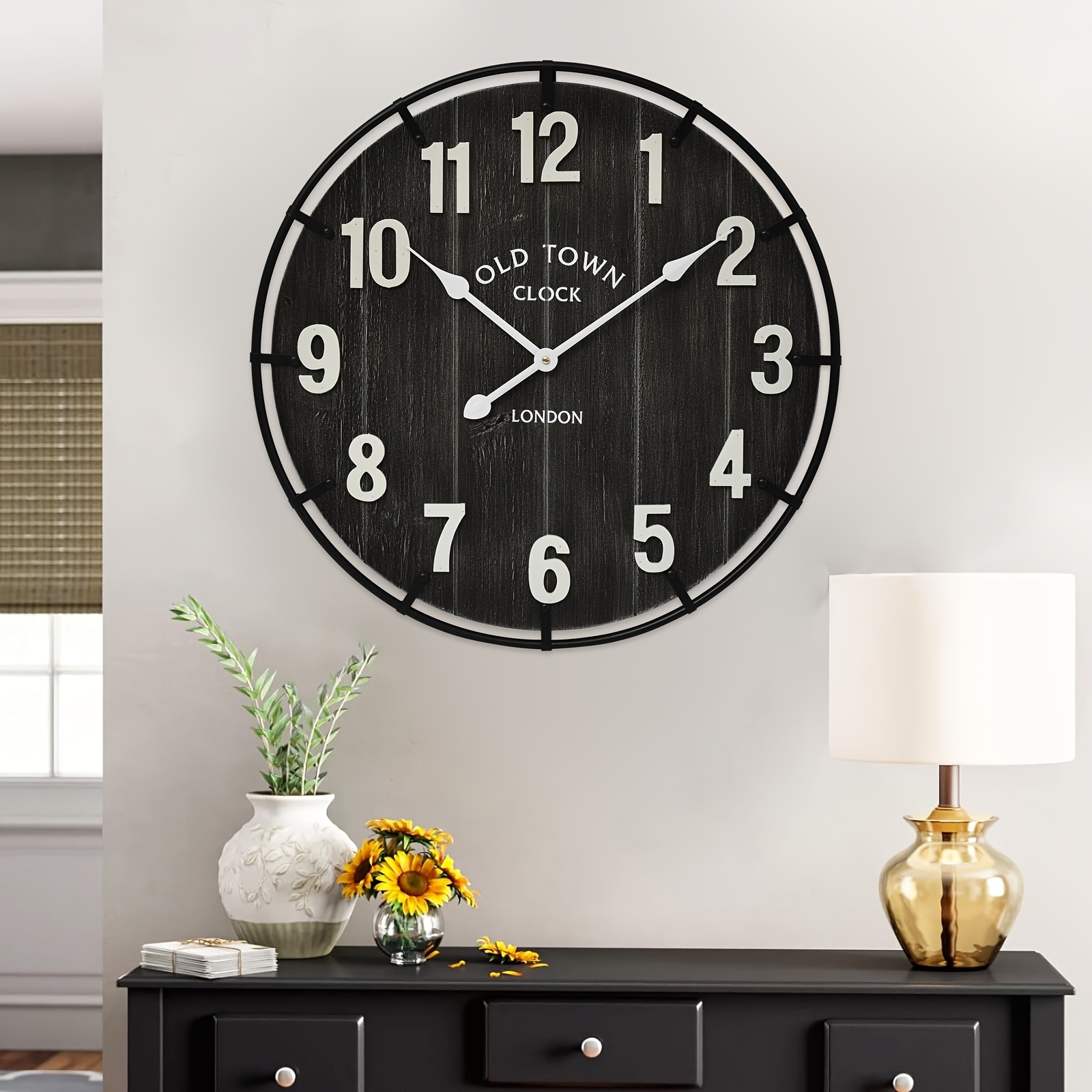 Large Farmhouse Wall Clock – 24 Inches Old Town Rustic Antique Wood With Metal Circle And Large Numerals, Silent Battery Operated Clock For Office, Kitchen, Bedroom, Living Room