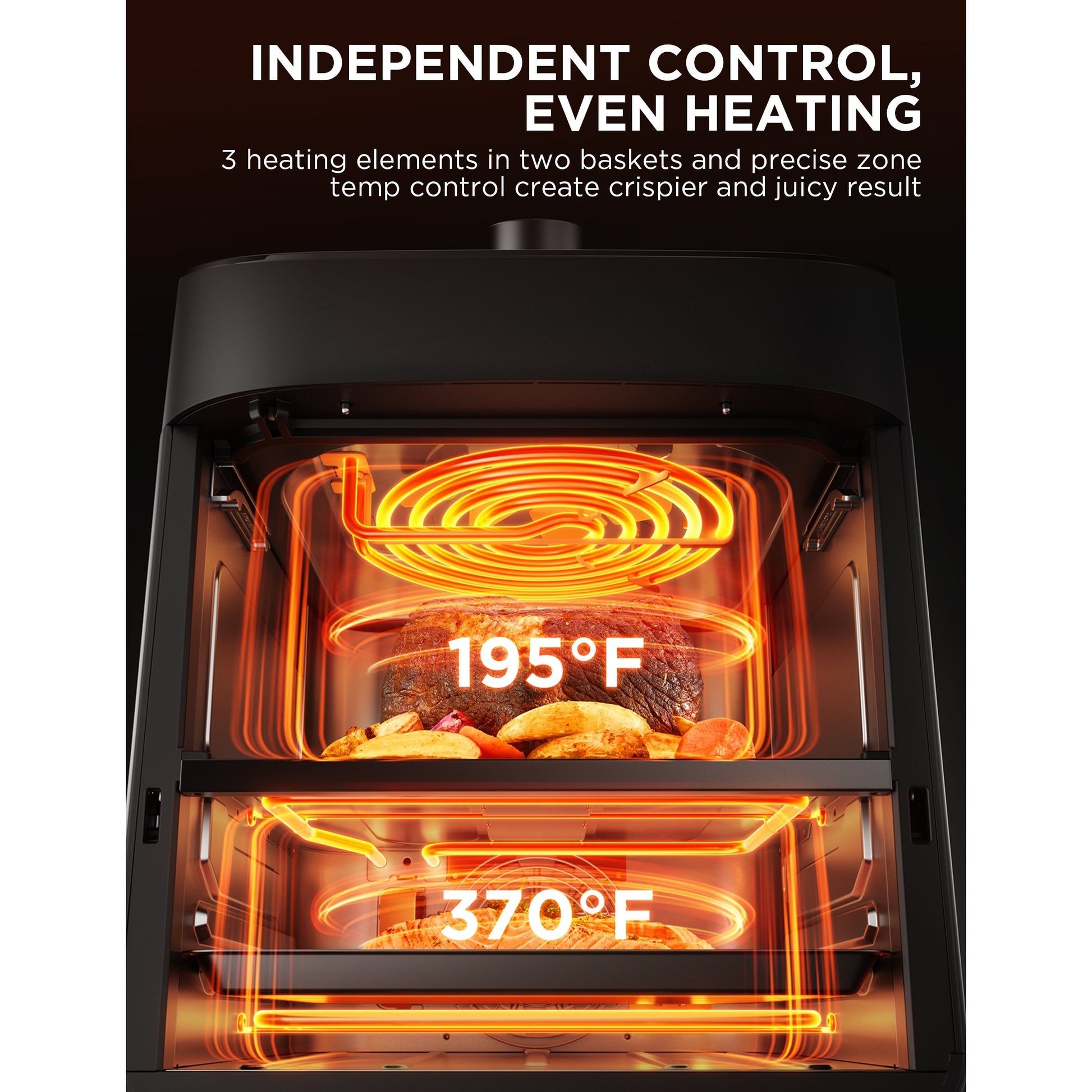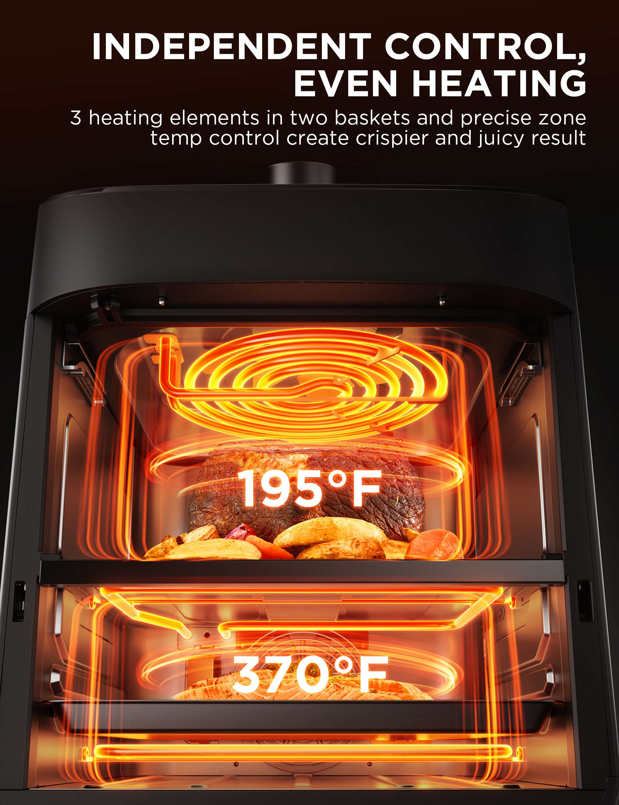 · This air fryer has a unique double-decker design with a 6QT basket on top and a 5QT baking pan below, providing a total of 11QT capacity while taking up less space. You can use the basket for fries and nuggets, and the pan for pizza and bread.