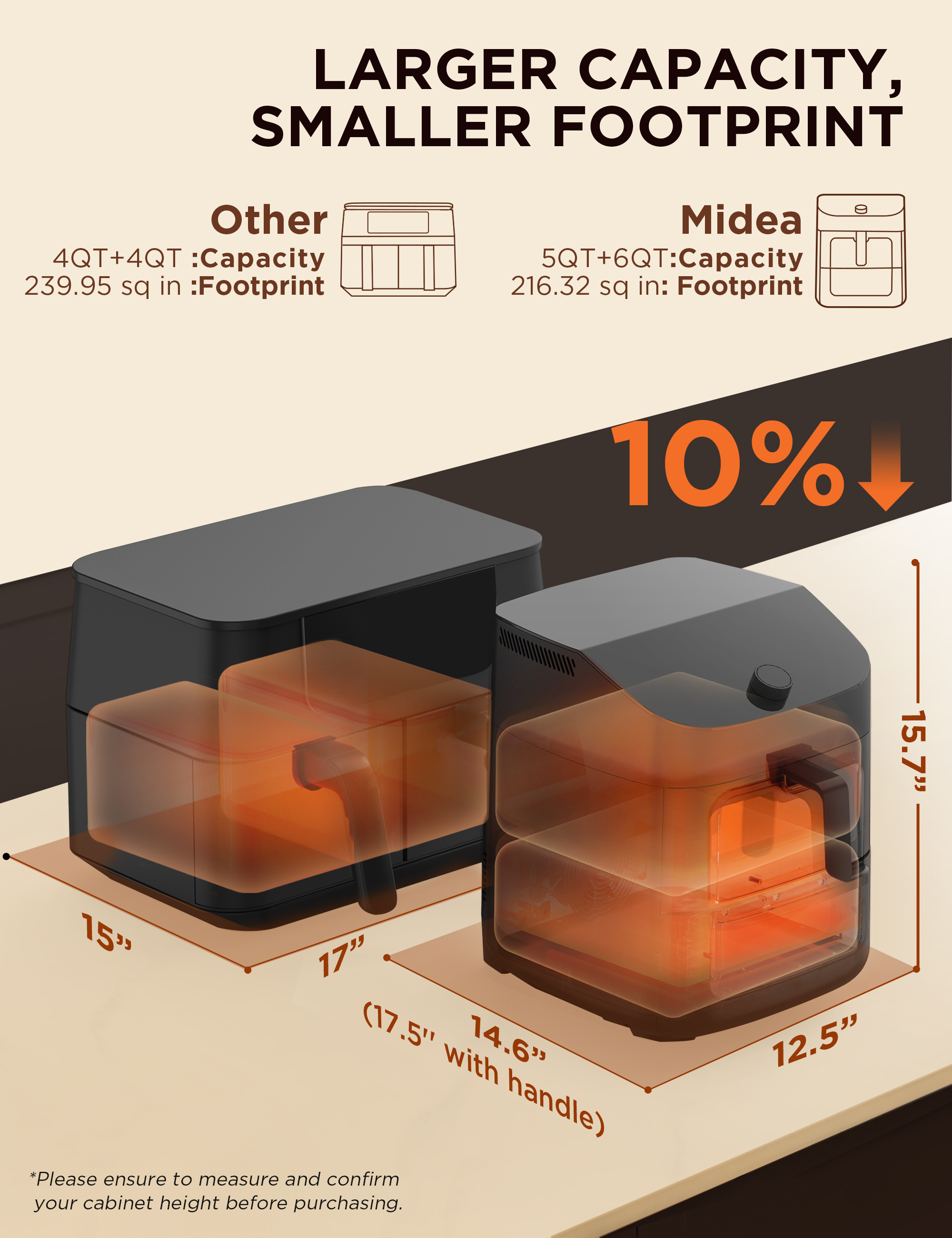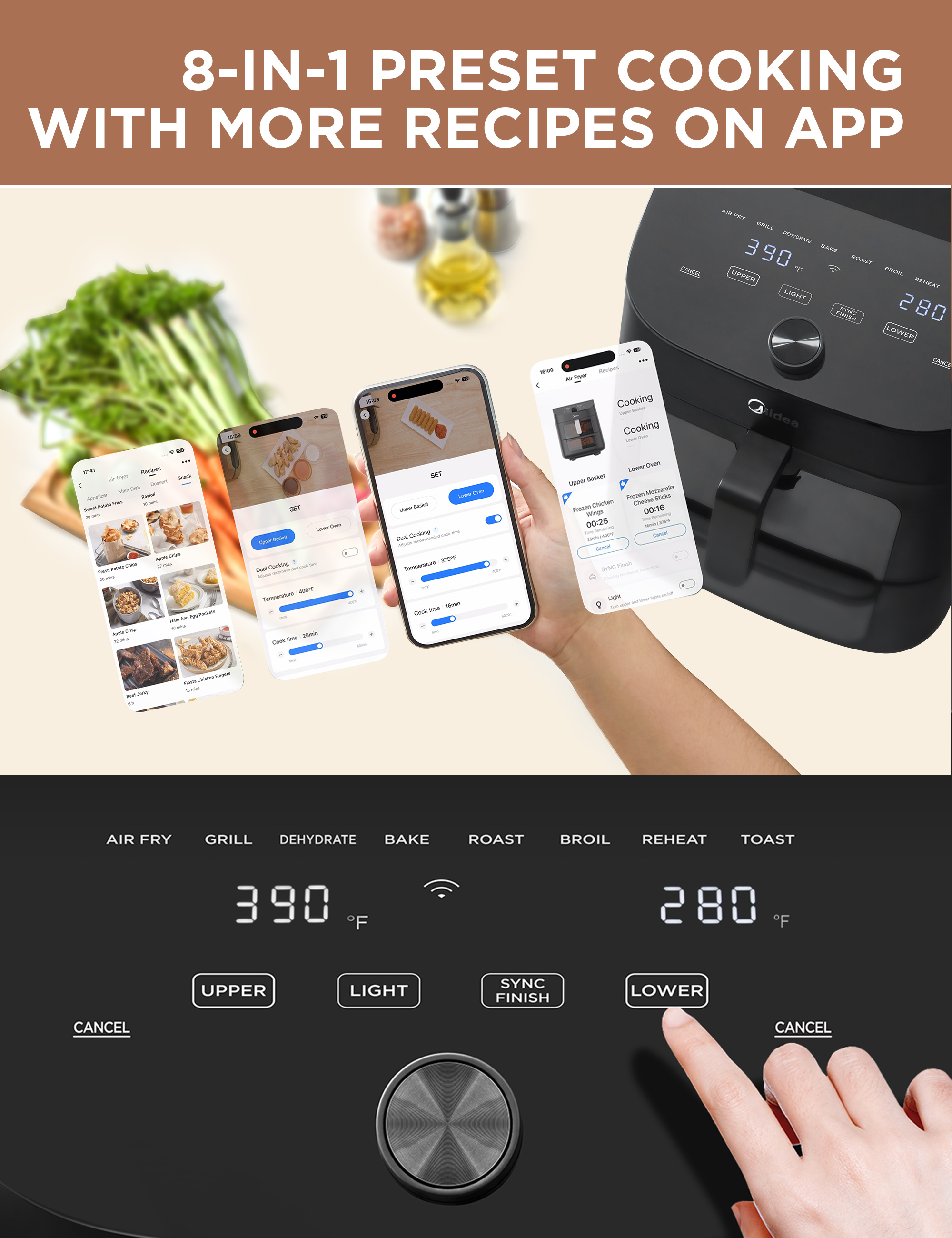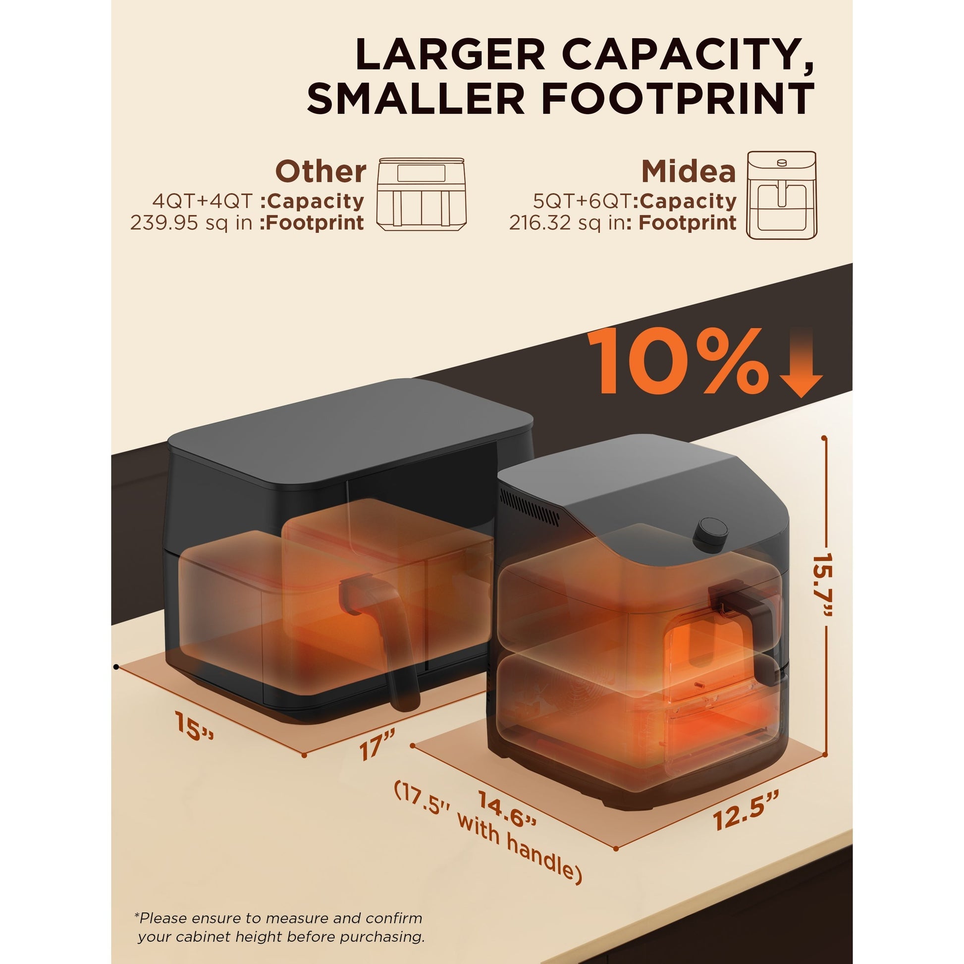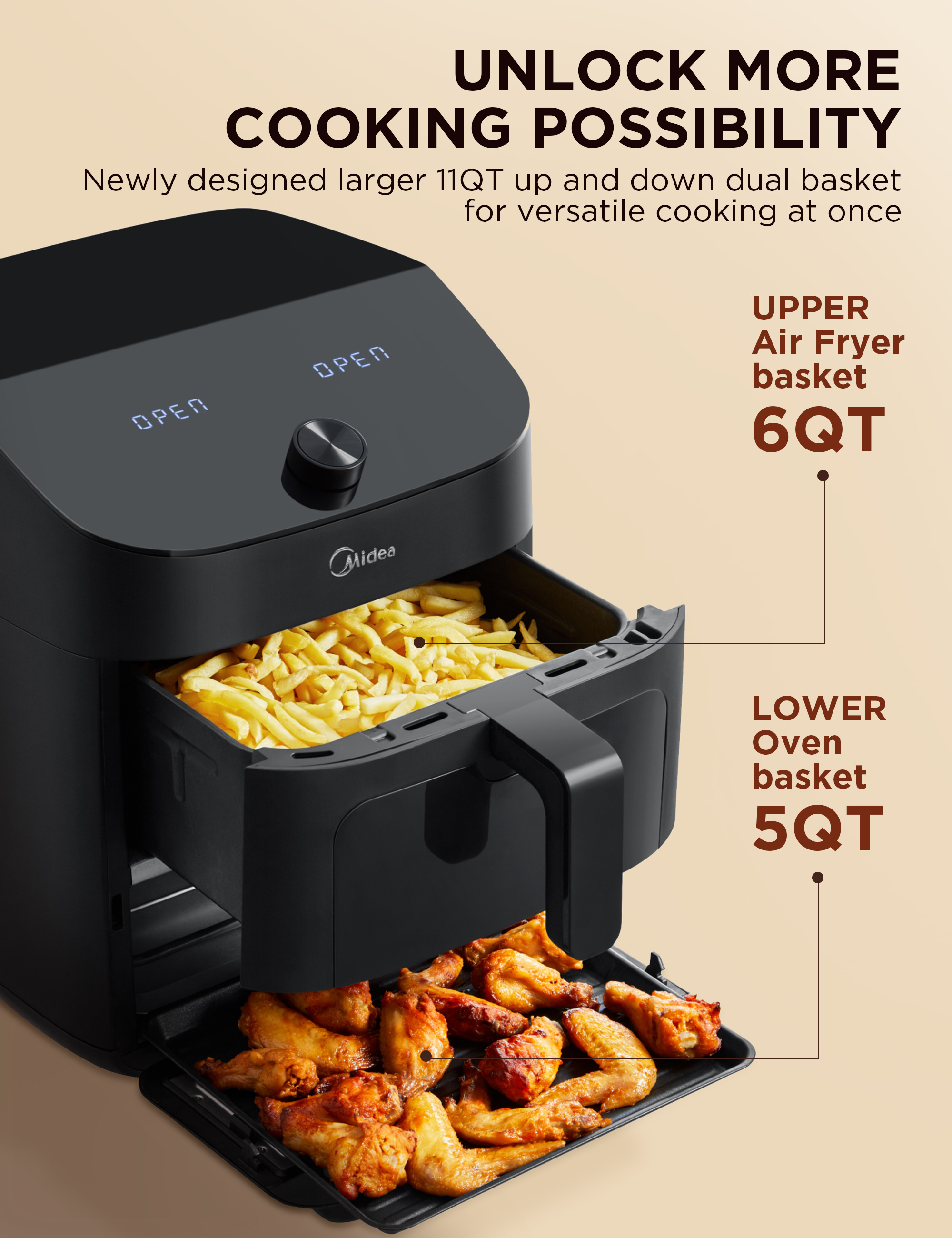 Midea Dual Basket Air Fryer Oven 11 Quart 8 in 1 Functions, Clear Window, Smart Sync Finish, Works with Alexa, Wi-Fi Connectivity, 50+ App Recipes for family meals, Bake, Roast, Grill, Broil, Toast
