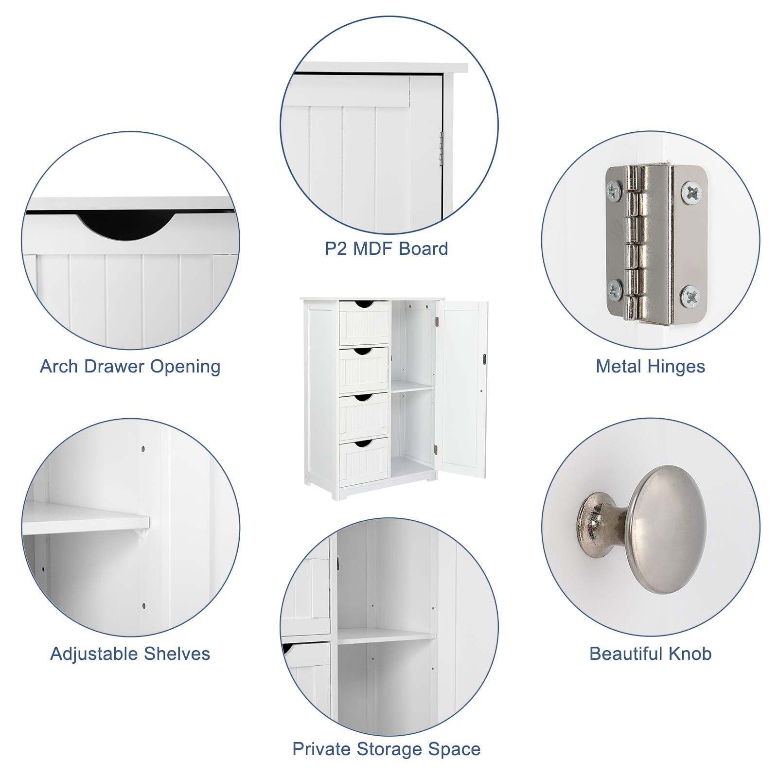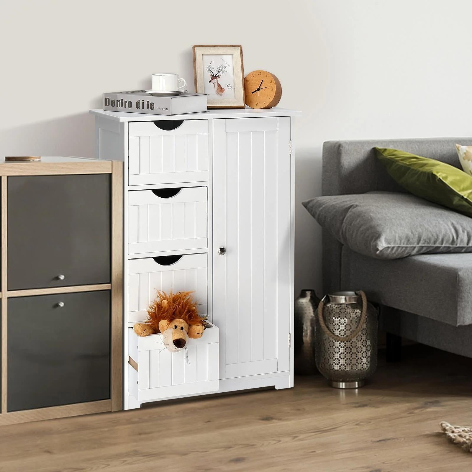 Modern White Metal Bathroom Floor Cabinet with 4-Drawer Storage & Door Cupboard - Space-Saving Vertical Organizer, Moisture-Resistant Design, Golden-Toned Hardware, Compact Modern Bathroom Storage Cabinet for Small Bathrooms,